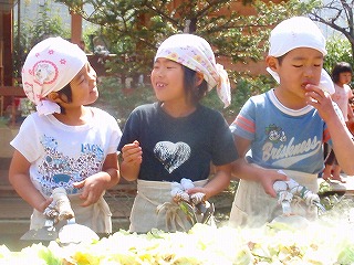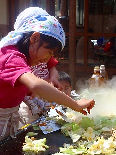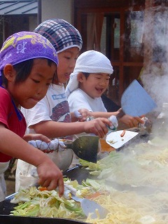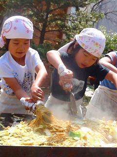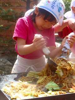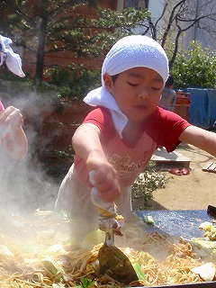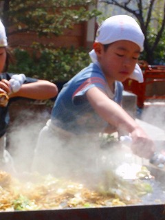 さて、見てください!いい表情でしょう〜!!年長さんでグループをわけて、みつばっちこ全員の焼きそばを作りました。