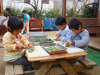 年長さんとご飯を食べながらの最後のひと時。春の日差しにつつまれながら、思い返すように楽しくお話がはずみます。「ねえ。みつばちで、い〜ちばん楽しかったことってな〜に?」と丸国がたずねてみると “え〜!い〜っぱいありすぎてどれかわからへん〜!西山で焚き火したり〜合宿もたのしかったし〜大日山もいったし〜絵も描いたし〜森は生きているもよんだし〜・・・” とМちゃんとHくん。「そうよな〜!じゃ、大変やったな〜!って思ったことは?」 “それは、雑巾の糸通しやな〜。朝して、昼までがんばって、や〜っと通ったんやで〜” “Mは、太鼓・はじめは難しかったわ〜”それらを細かに語る、ふたりの表情が「でも、もうできるようになったんやで!!すごいやろ」と、確かに、自分で乗り越えた自身に満ち溢れるようで・・・なんとも、すばらしい年長さんです。