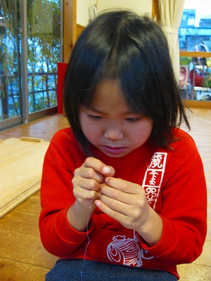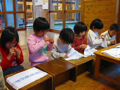 凛とした空気の中、細やかな手作業での雑巾縫い。小さい頃から、自然の中でたくさん遊びこみ、豊かな経験と育ちを育んできた中での就学前の年長さんの姿です。