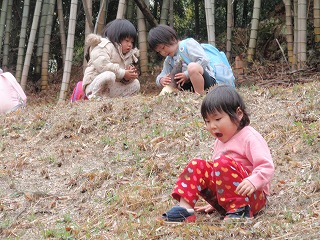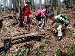 かえで組み3歳児さん。1歳の頃から目にし触れているだけあって、すっかり竹の子を見つけるのが上手。あったーと大きな声が竹やぶ中で響き、自分達でなんとか掘ろうと一生懸命。土の中にあるんやで。これねっこやー!と、様々に竹の子1つから語ってくれる子ども達。興味はすばらしく、いつしか皮をめくる子ども達。めくってみて〜まだあるで〜