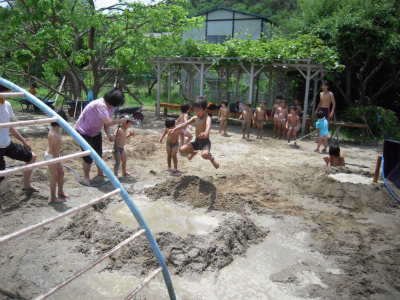 どろんこいっぱいに心も体もはずむ年長さん。