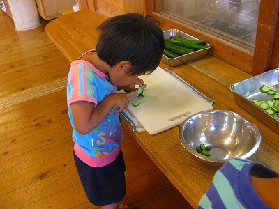 みつばちの給食室前カウンターでの毎日の光景に・・・今年もいよいよ、この姿!年長さんになってあこがれの「包丁」を使ってのお手伝いが始まりました!