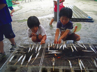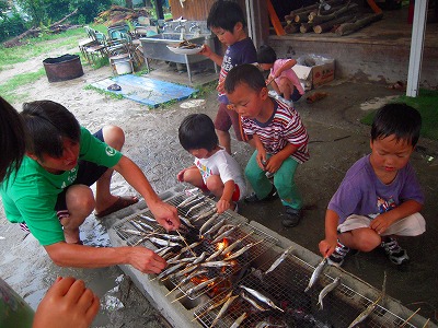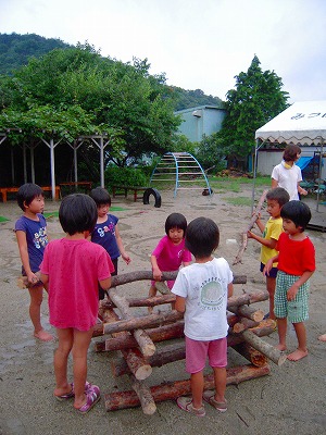 キャンプにむけて、山から木を集めてきては、のこぎりで切って薪の準備をしたり、竹筒ご飯をつくる竹を切りにいったり・・・。この何週間は西山でタイヤとびとキャンプの準備、そして泥んこ!!の毎日の年長さんです。