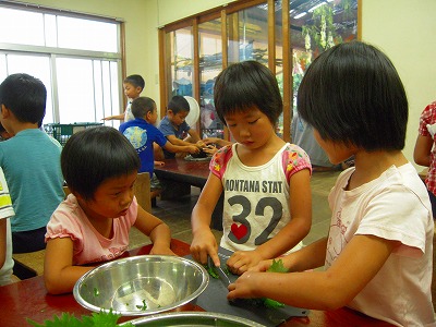 「こんなして、つくるしね〜」丸国の説明を、グイッと見入る年長さん。そして・・・うしろのほうには・・・憧れの瞳でおんなじように見入っている、すずめさん(2歳児)のMちゃん、Nちゃん。「何しはんのやろ??」最後まで聞き入っていましたよ。また、年長さんになったらするんだね。楽しみだね。