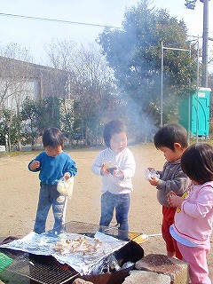 そして、お芋を洗って、新聞紙を巻いてぬらしてアルミを巻いて・・・ジブンデやると気持ちいっぱいです。そして、キノコを網の上においてみると・・いいにおい!